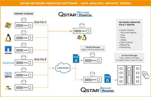 QStar Network Migrator (QNM) is a policy-based tiered storage and data lifecycle manager. QNM software uses advanced policy